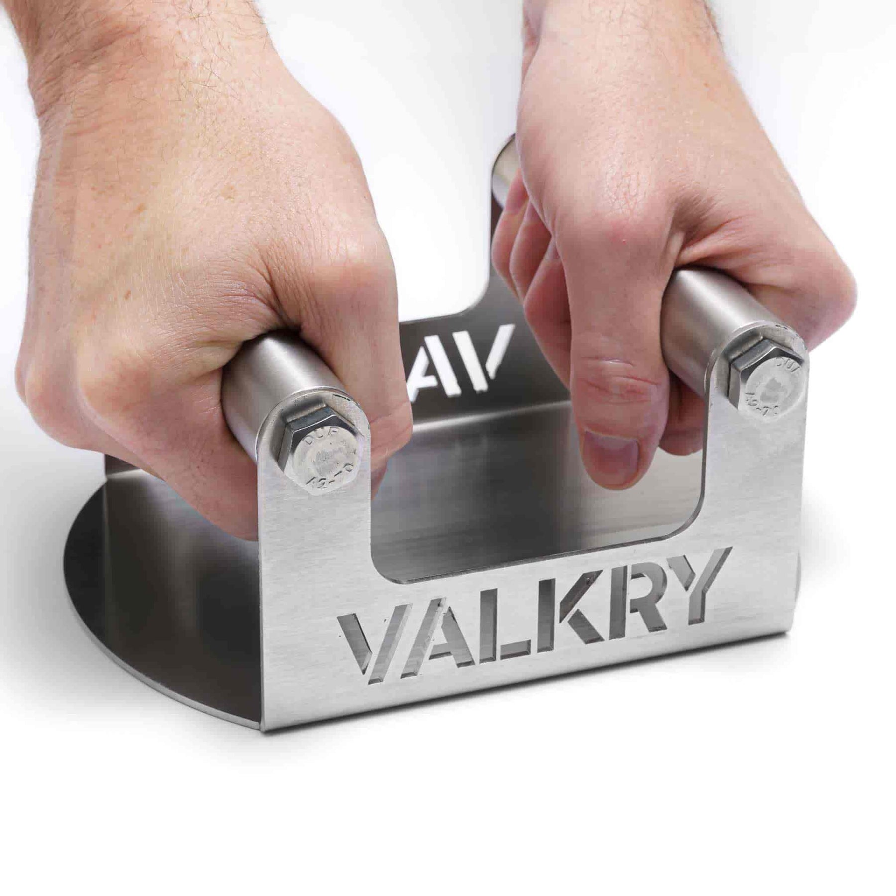 The Valkry Burger Smasher is designed to be used with two hands allowing you to apply maximum pressure on your burger patties. Made from 2mm 304 stainless steel and weighing 740g it can also be used as a steak weight.
